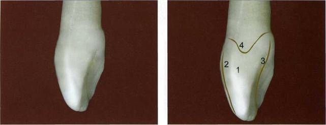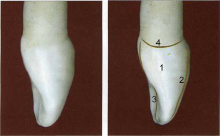 Рис. 681 Рис. 682 Рис. 682. 1 — медиальная поверхность; 2 — вестибулярный контур; 3 — небный контур; 4 — анатомическая шейка Медиальная поверхность (1) напоминает треугольник, основание которого обращено к шейке зуба, верхушка — к режущему краю. Вестибулярный контур (2) имеет округлые очертания, в режущей трети наклон усиливается в небную сторону, вершина режущего края смещена от продольной линии оси корня. Небный контур (3) представлен изогнутой линией, выпуклой в пришеечной трети, в связи с развитием цервикального пояска, и вогнутый на границе пришеечной и средней трети, далее равномерно стремящийся к режущему краю. Дистальная контактная поверхность представлена на рис. 683-685.