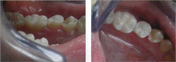 Рис. 712. Исходная клиническая ситуация Рис. 713. Сняты пломбы, отпрепарированы 45, 46 зубы