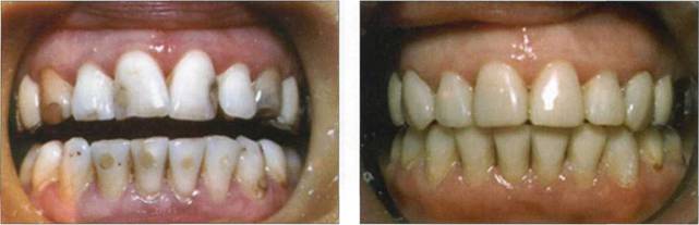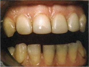 Рис. 743. Конечный результат Клинический пример 9 Пациентке 31 год, произведена реставрация фронтальной группы зубов материалом "Esthet-X" фирмы "DentSply".