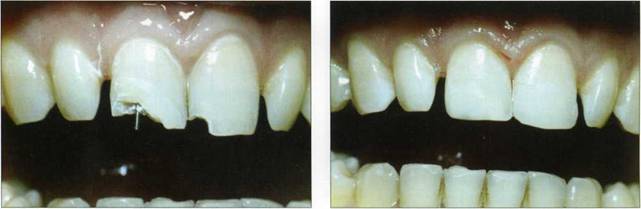 Пациенту 28 лет. Коронки верхних центральных резцов восстановлены материалом "XRV Herculate" фирмы "Кегг", с применением парапульпарных штифтов