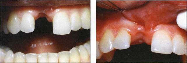 Клинический пример 29 Пациентке 21 год. Вторичная адентия 11 зуба. Включеный дефект в области 11 восстановлен путем применения материала "GlasSpan" и композиционной массы "Charisma" фирмы "Heraeus KULZER".