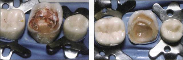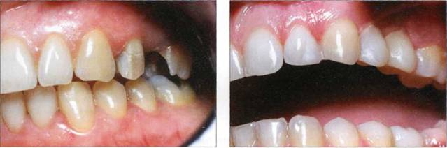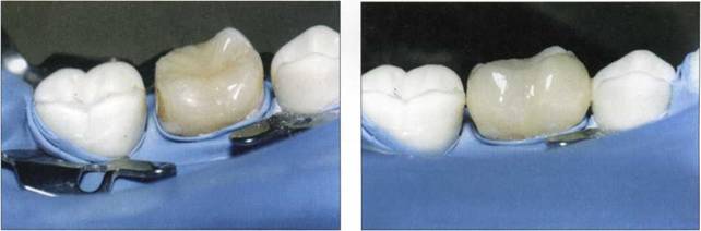 Рис. 826. Исходная клиническая ситуация Рис. 827. Конечный результат Клинический пример 34 В фантомную модель нижней челюсти в области 46 зуба введен большой коренной моляр, ранее леченный по поводу осложненного кариеса с применением резорцин-формалинового метода. Коронка 46 разрушена на 2/3, отсутствует язычная стенка. Произведено восстановление коронки 46 зуба материалом "Esthet-X" фирмы "DentSply", с применением усиливающей конструкции системы "GlasSpan".