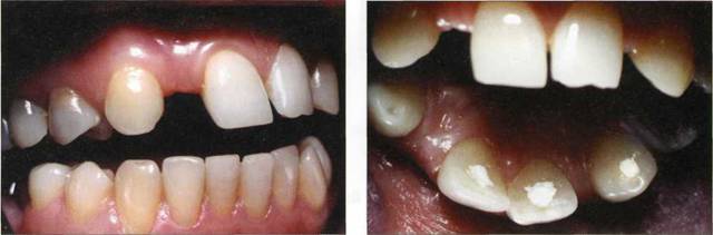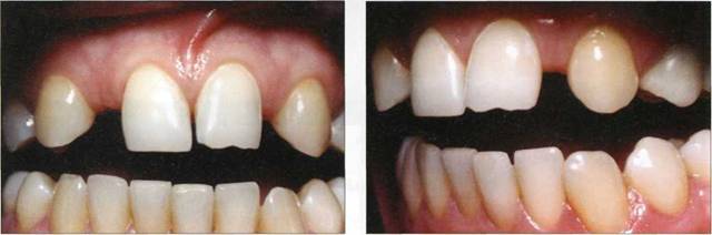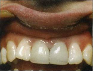 Рис. 869. Исходная клиническая ситуация Рис. 870. Готовые композиционные коронки на 11, 21 зубы КЛИНИЧЕСКОЕ ПРИМЕНЕНИЕ ОСНОВ ХУДОЖЕСТВЕННОГО МОДЕЛИРОВАНИЯ ♦ 229