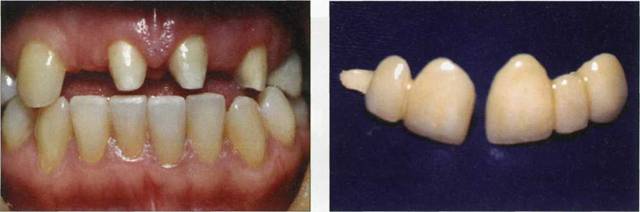 Рис. 879. Вид коронок 13, 11, 21, 23 зубов после препариро- Рис. 880. Изготовленная композиционная конструкция вания. КЛИНИЧЕСКОЕ ПРИМЕНЕНИЕ ОСНОВ ХУДОЖЕСТВЕННОГО МОДЕЛИРОВАНИЯ ♦ 231
