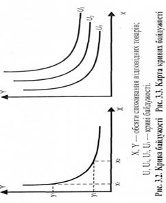 Карта кривих байдужості — це засіб відображення переваг споживача, що відповідають різному рівню задоволення його потреб (рис. 3.3). Карта кривих байдужості складається з безлічі ліній, що не перетинаються. Властивості кривих байдужості