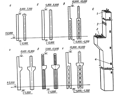 Рис.13.6 – Основные типы железобетонных колонн одноэтажных промышленных зданий: а - прямоугольного сечения для зданий без мостовых кранов при шаге 6 м; б – то же, при шаге 12 м; в – двухветвевые для зданий без мостовых кранов; г - прямоугольного сечения для зданий с мостовыми кранами; д – то же, двухтаврового сечения; е - двухветвевые для зданий с мостовыми кранами; е - общий вид колонны; 1 - закладочная деталь для крепления несущей конструкции покрытия; 2, 3 - то же, подкрановой балки; 4 - то же, стеновых панелей