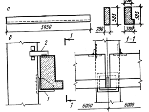 Рис.13.10 – Обвязочные балки: а - общий вид; б - узел крепления к колонне; 1 - стальной опорный столик; 2 - стальная планка