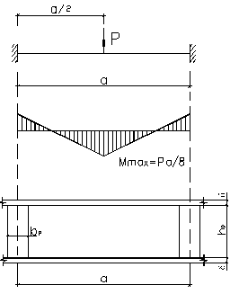 Рис. 3.3. Расчетная схема верхней фанерной обшивки при действии сосредоточенной монтажной нагрузки Р=1кН. (Вес человека с инструментами). Расчетный изгибающий момент равен