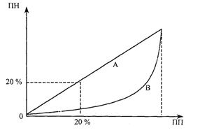 За економічним змістом податкова система є сукупністю встановлених у державі податків і платежів, що надходять до централізованих фондів грошових ресурсів держави. Ширше трактується система оподаткування. Це сукупність податків і платежів, а також принципів, методів та засобів справляння і контролю за їх надходженням до централізованих фондів. Незважаючи на різноманітність податкових систем у різних країнах світу, існують принципи, які забезпечують загальнонау-кові основи побудови податкової системи: 1) принцип вигоди та адміністративної зручності; 2) принцип платоспроможності; 3) принцип визначальної бази. Принцип вигоди та адміністративної зручності полягає у тому, що втрати внаслідок сплати податків мають бути сумірними з тими вигодами, які платники отримують за рахунок фінансованих із податкових надходжень потреб і суспільних благ. Суть адміністративної зручності у тому, що податкова система має бути максимально зручною для податкоплатників і держави з точки зору організації податкової роботи. З принципу вигоди випливає, що державна діяльність у формі забезпечення державою суспільних благ має певну ціну, яка набуває форми податків. Ці податкові ціни отримали назву ціни по Ліндалю. Рівновага при обміні «податки—блага» виникає у разі, якщо податкові затрати на одиницю фінансованих державою суспільних благ здійснюються з граничною корисністю для кожного податкоплатника. Оптимальною є система, яка забезпечує не менше 80 % граничної корисності. Принцип платоспроможності декларує, що податковий тягар (величина податкових зобов'язань) має бути чітко визначений відповідно до платоспроможності податкоплатника (розміру доходів, обсягів споживання, майнового стану). З цим принципом пов'язані горизонтальні на вертикальні рівності в оподаткуванні. Горизонтальна рівність передбачає, що платники податків з однаковою платоспроможністю та податковою базою за доходом чи майном сплачують однакові суми протягом певного періоду. Вертикальна рівність досягається у разі, якщо платники податків з різною платоспроможністю сплачують різні за обсягом суми, що диференціюються згідно з певними етичними принципами соціальної справедливості. Ця рівність можлива за умови використання прогресивних ставок в оподаткуванні. Даний принцип вимірюється та оцінюється за допомогою діаграми Лоренца та коефіцієнта Джіні. Діаграма Лоренца дозволяє провести своєрідну паралель між податковими надходженнями до бюджету держави та сумарною кількістю платників податків. Ідеально бажаною є ситуація, коли певна кількість платників (наприклад 20 %), сплачують до бюджету відповідно двадцятивідсотковий обсяг податкових надходжень (на рисунку це пряма лінія). Дійсний розподіл доходів і податкових зобов'язань, який існує на даний час у тій чи іншій державі, відображає крива лінія.