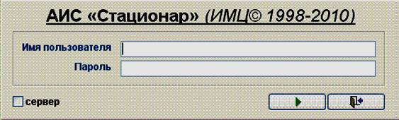1.1 Запуск АИС «Стационар» Запуск программы осуществляется двойным нажатием на левую кнопку мыши по ярлыку. В начале запуска система проверяет описание каталогов, настройку системных параметров и наличие необходимых для работы системы таблиц и других файлов. В случае успешного завершения подготовительных операций производится регистрация пользователя в системе путём авторизации через ввод кода (имени) пользователя и пароля.
