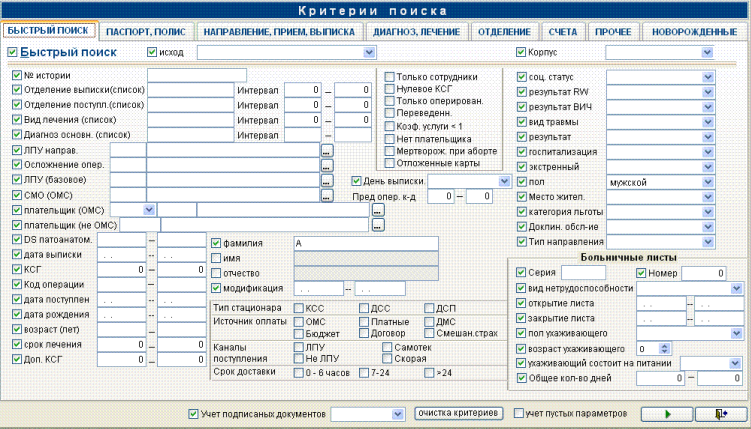 Рисунок 9 Ввод данных для выбора информации о предыдущих случаях госпитализации Выбор информации производится путем формирования соответствующего фильтра. Под фильтром понимается сочетание условий, которому должно удовлетворять информация в базе данных. Условия в фильтре соединяются логическим «И». Общий фильтр формируется как совокупность фильтров по отдельным информационнымсегментам: · 1-я страница: паспорт, полис (сегменты PID, ADR, INS); · 2-я страница: направление, прием, выписка (сегменты FRO, GET, OUT); · 3-я страница: основной диагноз, услуги, операции (сегменты DSM, SRV, INT); · 4-я страница: атрибуты счета в системе ОМС (сегмент CNT); · 5-я страница: информация об отделении (сегмент DEP) и прочие параметры (сегмент MIX). Фильтр по отдельному сегменту участвует в формировании общего фильтра, если включенпереключатель в заголовке сегмента-фильтра и внутри сегмента есть включенные переключатели длянекоторых параметров. Если включен переключатель «Учет пустых параметров» в нижней частиэкрана, в поиске участвуют параметры, значения которых не определены («пустые» параметрыпоиска). В противном случае для включенного параметра поиска должно быть указано некотороезначение; иначе параметр поиска считается отключенным (не участвующим в поиске). Значениепереключателя «Учет пустых параметров» по умолчанию может быть задано при настройкесистемы. Для вышеприведенного фрагмента фильтр имеет следующее значение: [первая буква фамилии]=«А» И [пол]= «мужской» И [дата рождения] не указана. Переключатель поля Документ в сегменте-фильтре PID выключен, поэтому значение этогополя (паспорт) не участвует в формировании фильтра. Переключатели сегментов фильтра ADR и INS выключены, поэтому значения полей этихсегментов не участвуют в формировании фильтра. На вкладке «быстрый поиск» собраны все критерии необходимые статистическому отделу. Навкладке новорожденные собраны все критерии поиска по новорожденным.