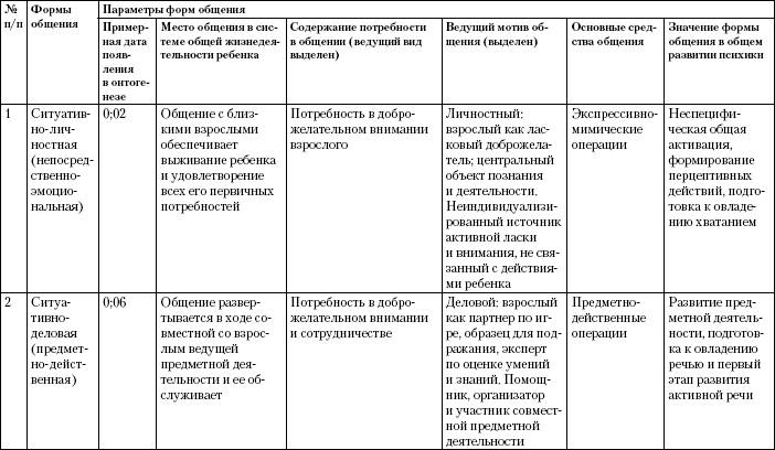 Изменения отдельных аспектов, характеризующих развитие разных структурных компонентов общения – потребностей, мотивов, операций и пр., – в совокупности порождают интегральные, целостные образования, представляющие собой уровни развития коммуникативной деятельности. Эти качественно специфические образования, являющиеся этапами онтогенеза общения, были названы нами «формами общения» (А. В. Запорожец, М. И. Лисина // Развитие общения у дошкольников, 1974). Итак, формой общения мы называем коммуникативную деятельность на определенном этапе ее развития, взятую в целостной совокупности черт и характеризуемую по нескольким параметрам. Основными среди них являются следующие 5 параметров: 1) время возникновения данной формы общения на протяжении дошкольного детства; 2) место, занимаемое ею в системе более широкой жизнедеятельности ребенка; 3) основное содержание потребности, удовлетворяемой детьми при данной форме общения; 4) ведущие мотивы, побуждающие ребенка на определенном этапе развития к общению с окружающими людьми; 5) основные средства общения, с помощью которых в пределах данной формы общения осуществляются коммуникации ребенка с людьми. Прежде чем двигаться дальше, следует сделать одно разъяснение. Оно касается термина «содержание потребности в общении». В главе 2, говоря о коммуникативной потребности, мы определили ее общую природу (стремление человека к самопознанию и самооценке через познание и оценку других людей и с их помощью); подчеркнули специфику (несводимость к каким–либо другим потребностям); выделили 4 критерия для описания процесса первичного становления потребности в общении (он завершается к 2 мес. в сфере общения ребенка со взрослыми и к 2 годам в сфере его общения с другими детьми). Но после оформления потребности в общении процесс ее развития не заканчивается: скорее, можно сказать, что он только начинается. На протяжении многих последующих лет коммуникативная потребность преобразуется, видоизменяется. На каждом возрастном этапе возникает новое содержание потребности в общении: что именно ищет ребенок в других людях, ради чего он к ним обращается и что с их помощью желает понять в самом себе. Экспериментальные исследования общения детей со взрослыми привели нас к выделению в первые 7 лет жизни следующих четырех видов содержания потребности в общении: 1) потребности в доброжелательном внимании (0,02–0,05, то есть от 2 до 5 мес.); 2) потребности в сотрудничестве (0,06–3, то есть от 6 мес. до 3 лет); 3) потребности в уважительном отношении взрослого (3–5); 4) потребности во взаимопонимании и сопереживании (5–7). Содержание потребности ребенка в общении с другими людьми зависит от общего характера его жизнедеятельности и места в ней общения среди других видов активности. В табл. 1.3 мы представили сведения, характеризующие основные генетические формы общения со взрослыми у детей от рождения до 7 лет. Их описание с разной степенью детальности представлено в некольких наших публикациях (Развитие общения у дошкольников, 1974; Принцип развития…, 1978; Проблемы общей…, 1978). Количество выделяемых нами форм, их названия и другие особенности постоянно уточняются и модифицируются. Возможно, стоит разделить ситуативно–деловое общение на довербальную и вербальную коммуникации, которые отличаются не только тем, овладел ли ребенок 