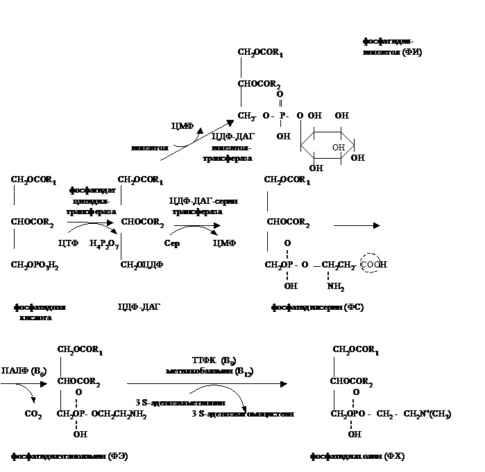 Синтез фосфолипидов (ФЛ) протекает в цитоплазме и на первых стадиях совпадает с синтезом ТАГ. На уровне фосфатидной кислоты и ДАГ эти процессы расходятся. Возможны 2 пути синтеза ФЛ. 1-ый путь характеризуется участием фосфатидной кислоты: