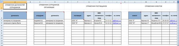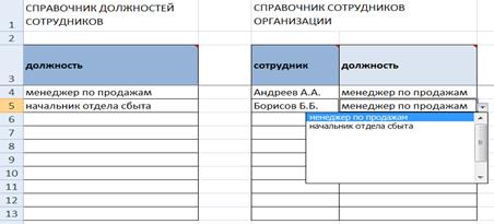 Создать и заполнить справочники: - «Должности сотрудников организации» – одно текстовое поле с названием «должность». Заполнить 3-5 строк, предусмотреть возможность расширения до 10 позиций. - «Сотрудники организации» 1. текстовое поле «сотрудник» с указанием Ф.И.О. сотрудника – вводится пользователем (5–10 сотрудников). 2. текстовое поле «должность» занимаемой сотрудником должности – организовать с помощью создания раскрывающегося списка из диапазона ячеек справочника Должностей (Приложение 1): · присвоить имя «должность» диапазону должностей (предусмотреть место для новых данных); · в заполняемом поле выполнить Данные / Проверка данных / Тип данных: список; Источник: =должность.