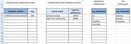 - «Клиенты» (потребители продукции) – текстовые поля: «клиент»(указать название организации), «адрес», «ФИО контактного лица», «телефон», «эл. почта». Справочник заполняется пользователем с помощью Формы, ввести данные для 4–5 клиентов. Переименовать третий лист книги MS Excel в Справочники-2. Создать и заполнить справочники: - «Товарные группы» – столбец «товарная_группа» (3–5 названий товарных групп); код группы (целочисленное значение, например, 100, 200 и т.д.). Обязательная товарная группа «хлебобулочные изделия» с кодом 100. - «Постоянные затраты»: фиксируются все постоянные затраты в течение месяца (аренда склада, кондитерского цеха, автотранспорта, зарплата персоналу, реклама оплата электроэнергии и т.д.). Структура справочника: «статья затрат»; «затраты, руб/месяц» – вводятся пользователем. - «Единицы измерения»: столбец «ед_измерения» (шт., кг, коробка, упаковка, …). - «Тип операции»: столбец «тип_операции» (приход, расход, списание).