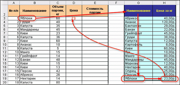 В наборе функций Excel, в категории Ссылки и массивы имеется функция ВПР. Эта функция ищет заданное значение (в нашем примере это слово "Яблоки") в крайнем левом столбце указанной таблицы (прайс-листа) двигаясь сверху-вниз и, найдя его, выдает содержимое соседней ячейки (23 руб.) Схематически работу этой функции можно представить так: