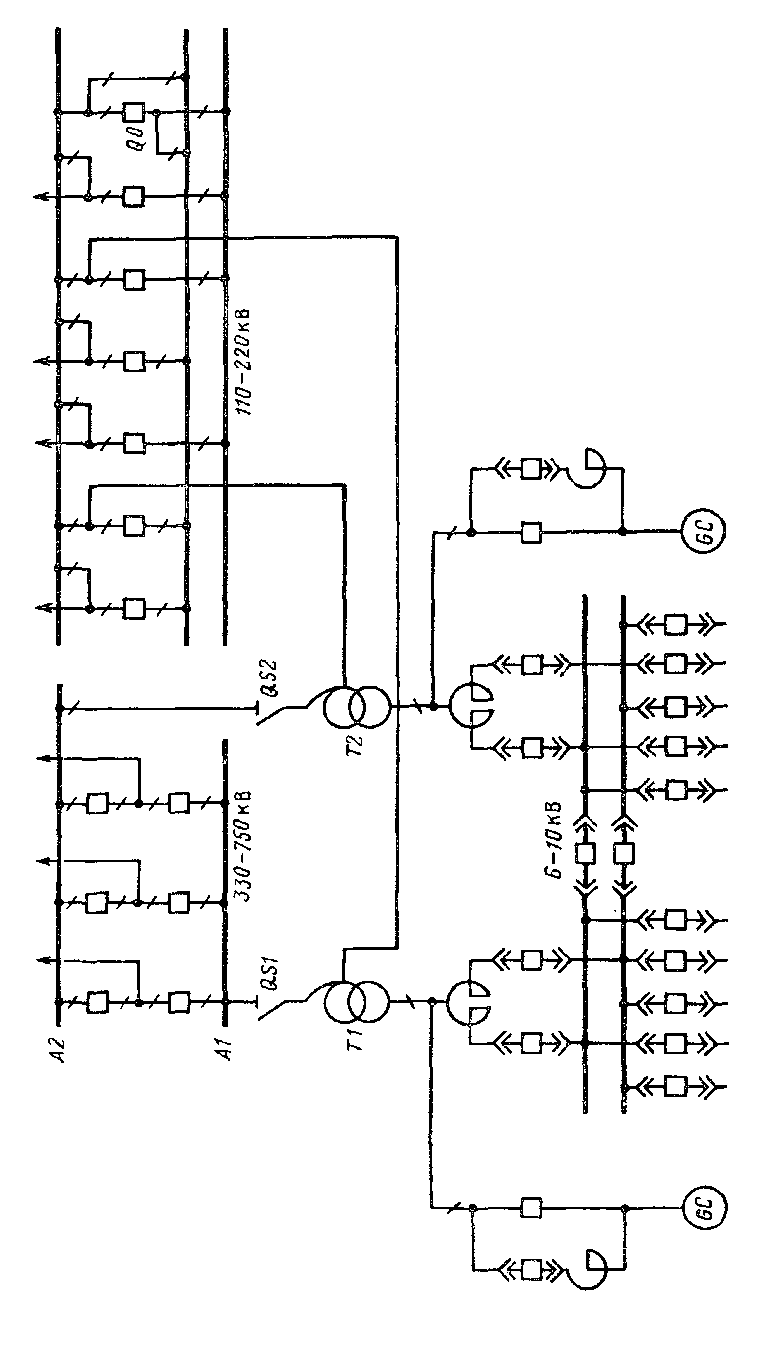 На шинах 330—750 кВ узловых подстанций осуществляется связь отдельных частей энергосистемы или связь двух систем, поэтому к схемам на стороне ВН предъявляют повышенные требования в отношении надежности. Как правило, в этом случае применяют схемы с многократным присоединением линий: кольцевые схемы (см. рис. 2.2), схемы 3/2 выключателя на цепь (см. рис. 2.7) и схемы трансформатор - шины с присоединением линий через два выключателя (при трех и четырех линиях) или с полуторным присоединением линий (при пяти-шести линиях). На рис. 3.6 показана схема мощной узловой подстанции. На стороне 330-750 кВ применена схема шины - автотрансформатор. В цепи каждой линии - два выключателя, автотрансформаторы присоединяются к шинам без выключателя (устанавливаются разъединители с дистанционным приводом). При повреждении Т1 отключаются все выключатели, присоединенные к А1, работа линий 330-750 кВ при этом не нарушается. После отключения Т1со всех сторон отключается дистанционно разъединитель QS1 и схема со стороны ВН восстанавливается включением всех выключателей, присоединенных к первой системе шин А1. В зависимости от числа линий 330—750 кВ возможно применение кольцевых схем или схемы 3/2 выключателя на цепь. На стороне среднего напряжения 110—220 кВ мощных подстанций применяется схема с одной рабочей и одной обходной системами шин или с двумя рабочими и одной обходной системами шин (см. рис. 2.4 и 2.6). Анализ и область применения этих схем рассмотрены в главе 2, в, г. При выборе схемы на стороне НН в первую очередь решается вопрос об ограничении тока КЗ. Для этой цели можно применять трансформаторы с повышенным значением Uкз, трансформаторы с расщепленной обмоткой НН или устанавливать реакторы в цепи трансформатора. В схеме, показанной на рис. 3.6, на стороне НН установлены сдвоенные реакторы. Синхронные компенсаторы с пусковыми реакторами присоединены непосредственно к выводам НН автотрансформаторов. Присоединение мощных GC к шинам 6—10 кВ привело бы к недопустимому увеличению токов КЗ. В цепях автотрансформаторов со стороны НН для независимого регулирования напряжения могут устанавливаться линейные регулировочные трансформаторы [6, § 2.2, ж]. Необходимость установки линейных регуляторов решается в проекте развития электрической сети ВН. Рис. 3.6. Схема узловой подстанции