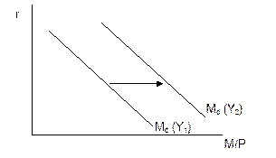 При росте ВВП с Y1 до Y2 спрос на реальные деньги возрастает при той же процентной ставке. Таким образом, кривая спроса на деньги смещается вправо. Классическая теория выводит функцию спроса на деньги из уравнения количественной теории денег: MV=PY, где M – денежная масса в экономике, V – число оборотов каждой денежной единицы в течение данного времени (скорость обращения денег), P – уровень цен в экономике, Y – реальный ВВП (реальный национальный доход). Отсюда видно, что потребность людей в деньгах тем больше, чем больше реальный ВВП и уровень цен и чем реже каждый рубль переходит из рук в руки. Переписав это уравнение, получаем функцию спроса на реальные деньги: