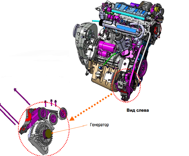 Поршни. ПоршниAE 300отлиты из алюминия со стальнымивставками под кольца. Днище поршня куполообразное свыточками для оптимизации сгорания. На стенкахпоршня имеются тефлоновые подушки для уменьшениятрения и повышения сопротивления прихватыванию. Картер двигателя. Картер двигателя AE300 представляет собойцельную деталь, изготовленную литьем поддавлением. Такая конструкция (чугунного литья) избавляет от необходимости изготовлять отдельныегильзы цилиндров. Литая чугунная конструкциякартера обеспечивает отказоустойчивую работу иуменьшение уровня издаваемого шума. ПосколькуконструктивноAE300 является двигателем с ряднымрасположением цилиндров с жидкостнымохлаждением, то картер включает в себя какцилиндры, так и каналы для охладителя. Конструкция картера позволяет устанавливать внутренний маслонасос, а также водяной насос, работающий от приводного ремня. Картер содержит поддон и масло для двигателя. Клапаны. В AE300 имеется16 клапанов: 8 впускных и8 выпускных. На каждый цилиндр приходится по4 клапана: двавпускных и два выпускных. Клапаны расположены по кругу вокруг центра камеры сгорания, что повышаетэффективность сгорания. Головка блока цилиндров. Головка блока цилиндров изготовлена из высокопрочного алюминиевого сплава. Она оснащена распредвалом с цепным приводом. Впуск в цилиндр и выпуск из него улучшены за счет расположения клапанов. Распределительные валы управляют работой16 клапанов–8 впускныхи 8 выпускных с гидравлической компенсацией зазора клапана. Форма камеры сгорания в AE 300 определена главным образом формой поршня. Клапаны расположены так, чтобы впускаемый воздух поступал в камеру сгорания в виде завихрения, что повышает эффективность сгорания. Инжектор топлива занимает центральное положение по отношению к четырем клапанам. Рядом с отверстием инжектора расположено отверстие для свечей подогрева, применяемых для предпускового подогрева. Остальные отверстия в головке блока цилиндров являются каналами для охладителя. Степень сжатия двигателя составляет 17,5:1. Генератор. Двигатель оснащен генератором переменного напряжения, установленным на тыльной стороне двигателя и работающим отприводного клиновидного ремня (рис. 45). В нем имеется встроенный регуляторнапряжения, во всем диапазоне скорости вращения двигателя онвырабатывает ток в70 Апри28 В. Во избежание повреждения генератора,при неработающем двигателе, регулятор напряжения должен быть отключен.