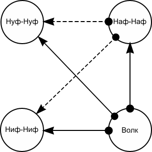 Прежде всего, надо построить вершины графа - выписать и расположить по кругу (чтоб удобнее было потом чертить взаимосвязи) все роли, имеющиеся в игре. В данном случае это Ниф-Ниф, Наф-Наф, Нуф-Нуф и Волк. Затем будем соединять вершины по следующему принципу: если для выполнения задачи данного игрока требуется взаимодействие с другим игроком, то соответствующие вершины соединяются стрелкой с началом у активного (выполняющего задачу) и концом у пассивного (необходимого для выполнения задачи) относительно задачи игрока. Обычно на стрелке пишется номер и для этого номера отдельно выписывается суть задачи (завязка вводной). В нашем примере завязок мало и используется тип линии. Описанный выше процесс повторяется для всех задач. В нашем примере таких задач две: Волк хочет съесть всех поросят (сплошная стрелка) и Наф-Наф агитирует других поросят строить каменный дом (пунктирная стрелка). Заметим, что на схеме отображаются только "первичные", "активно-позитивные" задачи, но не задачи типа "поросята не хотят быть съеденными", т.к. эта задача является следствием активности игрока играющего Волка. В результате получается схема (см. Рисунок). Теперь, пользуясь построенным графом, легко увидеть потенциальные дисбалансы в ходе игры: слишком много концов стрелок означают, что игрок является ключевым и от него сильно зависит протекание игры (следовательно, в этом месте не должно быть никаких сбоев), слишком много начал стрелок означает перегруженность игрока, слишком мало концов - "провис" (недогруженность). В данном случае видно, что Ниф-Ниф и Нуф-Нуф "провисают" по деятельности, фактически не имеют задач на игру, а Волк - чрезмерно перегружен завязками. Следует отметить, что более глубокий вариант анализа на основе "шестеренки" (выявление изолированных друг от друга групп игроков, балансировка в зависимости от уровня предполагаемых участников и т.п.), а также построение дополнительных "шестеренок" разной степени детализации (например отдельно для стран, городов внутри страны и отдельных людей внутри города) позволяет получить достаточно точное представление о предстоящем ходе игры, а следовательно, предоставляет большие возможности по корректировке и планированию РИ. П. Шилов При проведении игры необходимо учитывать одно важное обстоятельство: коллектив игроков разыгрывает в игре только то, что "на себе несет". Материал сюжета, структура ролей не могут заставить игроков действовать (действовать, а не вести себя) так как должны действовать их персонажи "на самом деле". Для детских и молодежных коллективов характерно воспроизводство в игре коммунальных (или индивидуально-личностных отношений). Чисто развлекательная игра практически всегда сводится к той или иной разновидности "игры в войну" - к личностному или личностно-групповому столкновению людей с использованием игрового оружия и других игровых вещей. Принадлежность (по сюжету) к некоторому "народу" (эльфы, орки и т.п.), или некому государству, или другому игровому образованию играет роль отличительной метки, лейбла, такого же как, например, спортивная форма. Сюжет, ролевая структура игры могут определить лишь то, насколько увлекательной и интересной будет игра, но никак не содержание основных игровых конфликтов. Игротехническое замечание. Чтобы придать игре образовательный характер треб