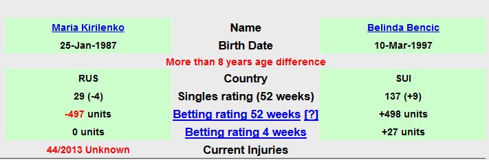 9) Получаем таблицу вот такого вида. Данная таблица, показывает сводную статистику, на каждого игрока, за последние матчи проведенные им, за 52недели. Таким образом, можно понять, кто в данной ситуации является фаворитом, из этих двух участников матча. (Основываясь на поле units -497 и units +498), делаем вывод, что в данном случае, в матче между ( Кириленко Мария-Бенчич Белинда) Видим, что явное преимущество по очкам, за последние 52недели, у Бенчич Белинда. Таким образом, делаем ставку у себя в БК, на победу Бенчич Белинда. (П2) Так же возможна ситуация, когда у обоих игроков, поле units будет находиться на равных значения, например, либо (units у обоих -300; -300, либо +300; +310) - это значит, что игроки равные. И точно предсказать, кто одержит победу в данном матче, СЛОЖНО! Поэтому пропускаем такой матч.
