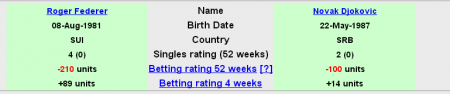 Если минус по 54 неделях на Игрока 1 большой а на 2 плюс большой, тогда совсем не важно какой результат по 4 неделях. Но спираемся опять же на схему "Ставить лучше на того у кого два плюса". Если на Игрока 1 плюс по 54 неделях где-то 100,200,и по 4 неделях так же,а на Игрока 2 по 54 неделях -100, -200 а по 4 плюс 300-400 то 75% того что победа второго игрока.