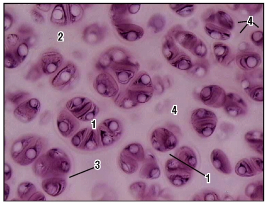 Рис. 81. Гиалиновая хрящевая ткань. Зона зрелого хряща. Поперечный срез (окраска гематоксилином и эозином, большое увеличение): Изогенные группы хондроцитов; Межклеточное вещество (матрикс хряща); Территориальный матрикс; интертерриториальный матрикс