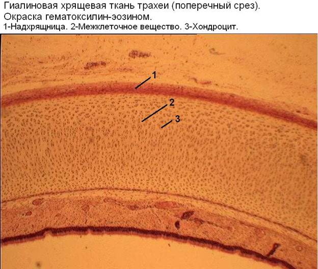 Рис. 82. Эластический хрящ. Поперечный срез (окраска гематоксилином и орсеином, малое увеличение): I - надхрящница; 1 - одиночные хондроциты; 2 - изогенные группы хондроцитов (колонки); 3 - межклеточное вещество хряща с эластическими волокнами