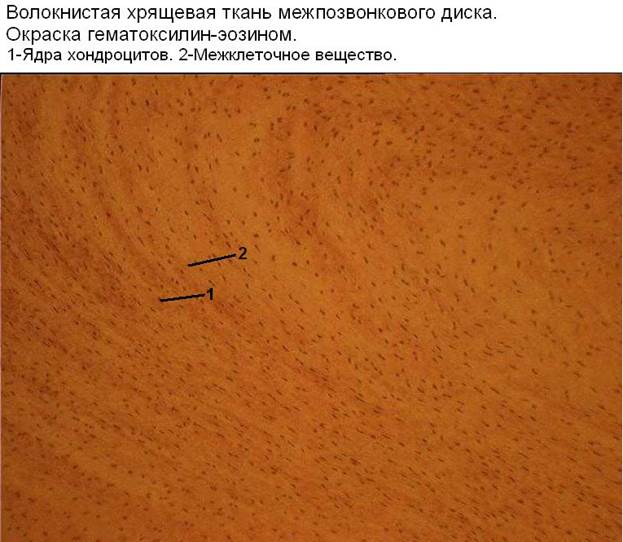 Рис. 83 а. Волокнистая хрящевая ткань (фрагмент волокнистого хряща) (окраска гематоксилином и эозином, малое увеличение): 1 - хрящевые клетки; 2 - коллагеновые волокна