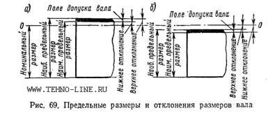 Выше мы видели, что по ряду причин невозможно обработать какую-либо деталь так, чтобы размеры ее, получившиеся после обработки, точно совпали с номинальными. Размеры, полученные после обработки, условились называть действительными. Таким образом, действительный размер детали есть тот размер, который установлен путем измерения. Алгебраическая разность между действительным и номинальным размерами называется действительным отклонением размера. Действительные отклонения могут быть положительными и отрицательными. Предельные размеры. Действительные размеры одинаковых деталей, даже при одном и том же способе их обработки, не получаются равными между собой, а колеблются в некоторых пределах. Предельными называются те размеры, между которыми может колебаться действительный размер. Один из них называется наибольшим, другой — наименьшим предельным размером. Требуемый характер сопряжения двух деталей создается, очевидно, лишь в том случае, если допустимые предельные размеры деталей установлены заранее опытным или расчетным путем и действительные размеры лежат между предельными. В зависимости от характера посадки наибольший и наименьший предельные размеры вала могут быть больше (рис. 69, а) или меньше (рис. 69, б) его номинального размера. Точно так же наибольший и наименьший предельные размеры отверстия могут быть больше (рис. 70, а) или меньше (рис. 70, б) его номинального размера. Возможно также расположение предельных размеров отверстия или вала по разные стороны от номинального. На рис. 69 и 70 цифрами 00 обозначена так называемая нулевая линия. Она соответствует номинальному диаметру вала или отверстия и служит началом отсчета отклонений от номинального размера. Предельные отклонения. Алгебраическую разность между наибольшим предельным и номинальным размерами называют верхним предельным отклонением. Алгебраическую разность между наименьшим предельным и номинальным размерами называют нижним предельным отклонением.