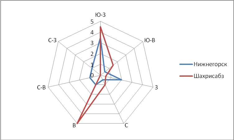 Сравнительный график розы ветров Нижнегорского района в Крыму и Шахрисабзкого района в Узбекистане (август).