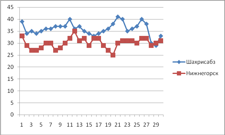 Приложение В Сравнительный график температуры Нижнегорского района в Крыму и Шахрисабзкого района в Узбекистане (июнь).