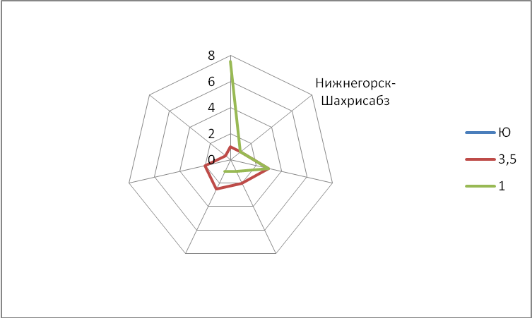 Сравнительный график розы ветров Нижнегорского района в Крыму и Шахрисабзкого района в Узбекистане (июнь).