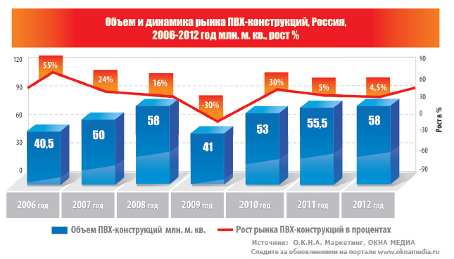 В 2012 году ситуация на рынке пластиковых окон повторяла динамику нисходящего экономического тренда в России. Это выражалось в снижении поквартальных темпов роста рынка окон и цен на них.