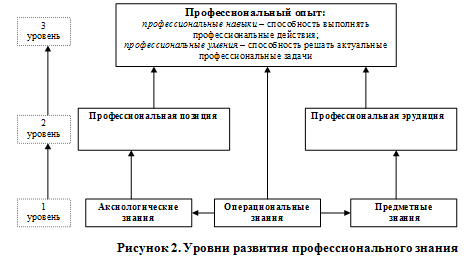 Рис.2. Уровни развития профессиональных знаний На рисунке 2 представлены три уровня развития знаний. На 1 уровне аксиологическая, операциональная и предметная информация превращается в соответствующие знания. Аксиологические знания – это знание о ценностных ориентирах профессиональной деятельности, операциональные о методах деятельности, предметные – о ее содержании. На 2 уровне формируется профессиональная позиция и профессиональная эрудиция. 3 уровень – это профессиональный опыт. Признаками профессионального опыта являются профессиональные навыки служащего и умения решать служебные задачи по определенной должности. Эффективность деятельности конкретного муниципального служащего, можно определить по уровню его предметных знаний, профессионального опыта и компетентности. Специфика деятельности на муниципальной службе связана с высокой ответственностью за принятые управленческие решения по социально-экономическому благоустройству населения и непосредственным контактом с населением. В основе деятельности на муниципальной службе должна быть социально-экономическая эффективность и качественное жизнеобеспечение населения[25]. Для успешной деятельности муниципальный служащий должен обладать рядом индивидуальных психологических свойств личности, т.к. многое зависит от характерологических особенностей личности, качественного своеобразия и уровня развития способностей. Исследуя проблему профессиональной компетентности различных категорий муниципальных служащихА.Ф. Мурашко предлагает следующий перечень показателей профессиональных и личных качеств, способствующих успешности деятельности: 1 категория – «руководители»(наряду с перечисленными ниже показателями качеств, руководители должны обладатькачествами, предъявляемыми и к специалисту): - Способность самостоятельно принимать решения - Оперативность принятия и реализации решений - Общая эрудиция и кругозор - Организаторские способности - Профессиональная предприимчивость с учетом требований рынка - Чувство долга и ответственности - Способность адаптироваться к новой ситуации и применять новые подходы к решению возникающих проблем - Умение держать слово - Принципиальность, честность - Умение вести деловые переговоры - Способность создать нормальные взаимоотношения в коллективе (психологический климат) - Восприимчивость к критике - Умение видеть, поддерживать и применять новое, передовое - Склонность советоваться с коллективом - Умение создать сплоченный коллектив - Умение эффективно и последовательно организовать работу по взаимосвязи с другими отделами, ведомственными и отраслевыми организациями, госорганами, отраслями, субъектами Российской Федерации. 2 категория – «специалисты»: - Профессиональная компетентность - Знание отечественного и зарубежного опыта - Полнота, оперативность и качество выполнения работ и заданий - Интенсивность труда - Творческая активность (наличие авторских свидетельств, печатных работ) - Энергичность и целеустремленность - Умение четко излагать свои мысли письменно и устно - Аналитические способности - Дисциплинированность - Владение иностранными языками - Работа над повышением своей квалификации - Умение не допускать личностных конфликтов с сотрудниками - Ответственность за порученное дело - Инициатив