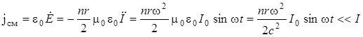 Понятие “тока смещение” впервые было введено Максвеллом. Сущность явления заключается в следующем. Постоянный ток не протекает в цепи с конденсатором. Переменный ток течет в такой цепи. Сила тока во всех последовательно соединенных элементах такой цепи одна и та же. В то же время, в конденсаторе ток проводимости, связанный с движением электронов, не может существовать, поскольку обкладки разделены диэлектриком. Поэтому в конденсаторе должен проходить какой – то процесс, который замыкает ток проводимости, текущий во всей остальной цепи. Этот процесс обеспечивает обмен зарядом между обкладками без переноса заряда между ними. Этот процесс называется током смещения. Необходимость процесса, замыкающего ток проводимости в конденсаторе, хорошо видна при использовании закона полного тока в такой цепи в дифференциальной форме: