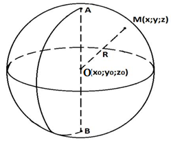 В прямоугольной системе координат уравнение сферы радиуса R с центром О (x 0; у 0; z 0) имеет вид: Если точка М лежит на данной сфере, то МС = R, или МС2 = R2, т. е. координаты точки М удовлетворяют данному уравнению. Если же точка М не лежит на данной сфере, то