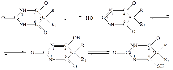 Имидольная или аци-форма обусловливает кислый характер производных барбитуровой кислоты. В присутствии гидроксид-ионов они диссоциируют как кислоты и образуют соли с металлами: