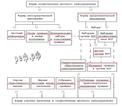 Рис. 1.7.1. Формы участия граждан в местном самоуправлении Первая - формы непосредственного осуществления населением местного самоуправления путем принятия обязательных для исполнения решений. Вторая - формы участия населения в осуществлении местного самоуправления на основе собственных инициатив. Формами непосредственного осуществления населением местного самоуправления являются: - местные референдумы; - муниципальные выборы; - голосования по отзыву депутатов и выборных должностных лиц местного самоуправления, по вопросам изменения границ и преобразования муниципальных образований; - сходы граждан в малых муниципальных образованиях . Ко второй группе относятся: участие граждан в опросах по различным вопросам местной жизни, собрания и конференции (собрания делегатов), публичные слушания, правотворческая инициатива граждан, обращения граждан в органы местного самоуправления, мирные массовые акции населения, а также разнообразные формы территориального общественного самоуправления, которые рассматриваются в разделе 1.8. Согласно Федеральному закону 2003 года, граждане вправе участвовать в осуществлении местного самоуправления и в иных формах, не противоречащих законодательству, т.е. перечень форм прямой демократии не ограничен. Участие граждан в местном самоуправлении основано на принципах законности и добровольности. Государственные органы и их должностные лица, а также органы и должностные лица местного самоуправления обязаны содействовать населению в осуществлении им местного самоуправления и участии в его осуществлении. - Подробнее на Referatwork.ru: http://referatwork.ru/municipalnoe_upravlenie/section-3-7.html