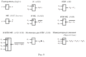КС с несколькими выходами может быть представлена в виде совокупности схем, у каждой из которых лишь один выход. Работа каждого выхода описывается либо таблицей истинности, либо логическим уравнением. В цифровой технике применяется большое число типовых (стандартных) КС, выполненных в виде интегральных схем малой и средней степени интеграции. Все многообразие КС, применяемых в цифровых устройствах, можно классифицировать по их основному функциональному назначению – по типу логической задачи, которую может решать КС в цифровом устройстве. По функциональному признаку можно сформировать следующие группы КС. Логические элементы (ЛЭ) общего назначения, выпускаемые в виде готовых интегральных логических схем малой степени интеграции. К ним относятся ЛЭ, представленные на рис.9. Они образуют технически полную систему элементов, т.е. удовлетворяющую требованиям функциональной и физической полноты. Функционально полная система элементов – система позволяющая реализовать любые, сколь угодно сложные ПФ путем представления их через типовые (базисные) функции. Физически полная система элементов – система, обеспечивающая работоспособность и надежное взаимодействие элементов при всевозможных комбинациях связи между ними (совместимость входных и выходных сигналов при воздействии на элемент нагрузок и дестабилизирующих факторов, при разбросе параметров и характеристик элементов и т.п.). Преобразователи кодов – дешифраторы, детекторы состояний, шифраторы, преобразователи специальных кодов, ПЗУ и др. Коммутационные узлы – ключи, мультиплексоры, мультиплексоры-демультиплексоры и др. Арифметические узлы – схемы контроля на четность, сумматоры, схемы ускоренного переноса, арифметико-логические устройства, числовые компараторы, умножители и др. Основными задачами изучения КС являются задачи анализа и синтеза этих схем. Задача анализа – нахождение функции, реализуемой конкретной схемой. Задача синтеза – преобразование заданной логической функции к форме, в которой ПФ представлена через логические функции заданных для реализации элементов. Например: через логические функции ЛЭ основного базиса, универсального базиса; через логические функции, реализуемые дешифратором, мультиплексором и т.п.