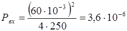5.1.4.1 Вихідні дані: 1) необхідна потужність на виході ПНЧ Рвих = 2,5 Вт; 2) опір навантаження Rн = 5 Ом; 3) напруга джерела вхідного сигналу Uвх = 60 мВ; 4) внутрішній опір джерела сигналу Rдж = 250 Ом; 5) схема з трансформаторним зв’язком; 6) діапазон частот f н = 50 Гц, f в = 20000 Гц. Вважаємо, що ПНЧ працює в стаціонарних умовах. Температура оточуючого середовища: Тmin = + 15°С; Тmax = + 25оС. 5.1.4.2 Необхідно визначити: 1) коефіцієнт підсилення ПНЧ за потужністю Кр; 2) тип схеми вихідного (кінцевого) каскаду; 3) типи транзисторів каскадів підсилення; 4) кількість каскадів підсилення (структурну схему ПНЧ); 5) орієнтовну електричну принципову схему ПНЧ. 5.1.4.3 Порядок розрахунку 5.1.4.3.1 Знаходимо потужність вхідного сигналу. Найбільша потужність віддається в навантаження, коли його опір дорівнює внутрішньому опору джерела. Тоді