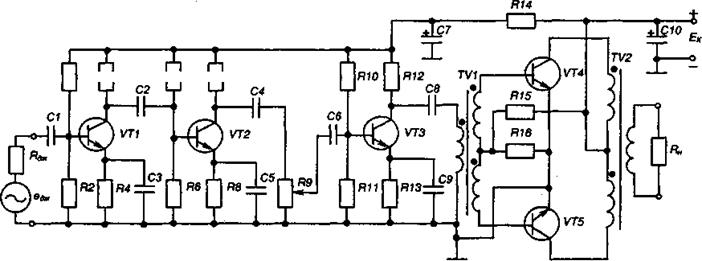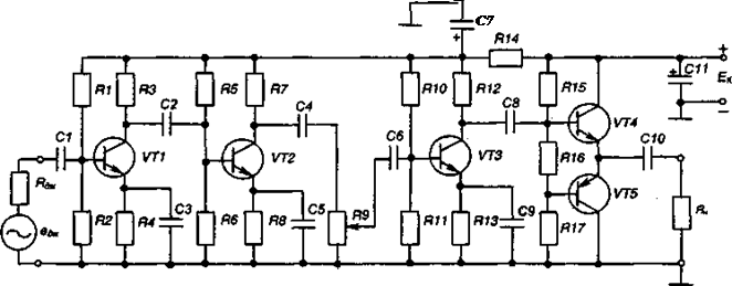 5.1.4.2.6 На основі структурної схеми, з урахуванням вище наведених міркувань складаємо орієнтовну принципову схему ПНЧ, що наведена на рис. 5.2. У цій схемі каскади попереднього підсилення виконано на транзисторах VT1- VT3, а кінцевий – на транзисторах VT4,VT5. Резистор R9 є регулятором рівня вихідного сигналу. Конденсатор С10 – фільтр напруги живлення ПНЧ, а RС -фільтр (R14С7) забезпечує додаткову фільтрацію напруги живлення каскадів попереднього підсилення (забезпечує виконання умов електромагнітної сумісності). Величина опору резистора R14 зазвичай складає декілька десятків Ом. 5.1.4.2.7 Якщо для вихідного каскаду обрати безтрансформаторну схему, то з формули (5.2) треба вилучити величини ηТвх і ηТвих. Тоді матимемо: