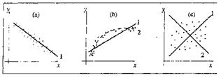 Рис.1 На рисунке изображены три ситуации: • на графике (а) взаимосвязь х и у близка к линейной; прямая линия (1) здесь близка к точкам наблюдений, и последние отклоняются от нее лишь в результате сравнительно небольших случайных воздействий; • на графике (b) реальная взаимосвязь величин х и у описывается нелинейной функцией (2), и какую бы мы ни провели прямую линию (например, 1), отклонения точек наблюдений от нее будут существенными и неслучайными; • на графике (с) явная взаимосвязь между переменными х и у отсутствует; какую бы мы ни выбрали формулу связи, результаты ее параметризации будут здесь неудачными. В частности, прямые линии 1 и 2, проведенные через "центр" "облака" точек наблюдений и имеющие противоположный наклон, одинаково плохи для того, чтобы делать выводы об ожидаемых значениях переменной у по значениям переменной х. Начальным пунктом эконометрического анализа зависимостей обычно является оценка линейной зависимости переменных. Если имеется некоторое "облако" точек наблюдений, через него всегда можно попытаться провести такую прямую линию, которая является наилучшей в определенном смысле среди всех прямых линий, то есть "ближайшей" к точкам наблюдений по их совокупности. Для этого мы вначале должны определить понятие близости прямой к некоторому множеству точек на плоскости; меры такой близости могут быть различными. Однако любая разумная мера должна быть, очевидно, связана с расстояниями от точек наблюдений до рассматриваемой прямой линии (задаваемой уравнением у = а + bх). Обычно в качестве критерия близости используется минимум суммы квадратов разностей наблюдений зависимой переменной у и теоретических, рассчитанных по уравнению регрессии значений (а + bхi):