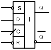 Рис. 3. Синхронный D – триггеры Символом * в таблице обозначены сигналы, не имеющие значения для данного режима. Т-триггеры. Т-триггер – это счетный триггер с одним информационным входом Т, изменяющий свое состояние на противоположное с приходом каждого счетного сигнала (табл.)