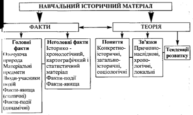 Зв'язки подібно до понять розподіляються на конкретно - історичні, загальноісторичні та всезагальні. У підручниках і посібниках теоретичний компонент присутній у вигляді відкритої теорії – положення, абзаци і пункти параграфів із розгорнутим поясненням ознак історичних понять, з характеристикою причин і наслідків історичних подій, закономірностей історичних явищ і процесів, з аргументованими оцінними судженнями. Може бути виділена шрифтом, позначена якимось спеціальним символом, обведена рамкою, щоб школярі звернули на неї особливу увагу. теорії, схованої у фактах – теоретичні положення прямо не повідомляються, а приховуються в спеціально організованому підборі і викладі історичних фактів і можуть бути виявлені при цілеспрямованих розумових зусиллях школярів, для чого використовуються відповідні питання: що спільного, що відмінного ви бачите у цих фактах, яке значення вони мали для подальшого розвитку подій, які висновки ми можемо зробити тощо. Автори навчальних книг і вчителі історії часто свідомо не повідомляють учням теоретичні відомості, а використовують елементи, наприклад, проблемного навчання, щоб розвивати самостійність і критичність мислення учнів, підтримувати активність і інтерес до предмета у школярів з високим рівнем навченості.