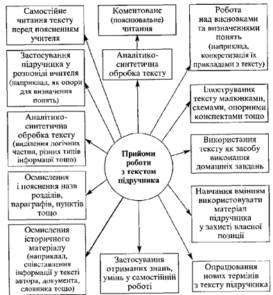 При усному поясненні нового матеріалу вчителем посібник буде корисним: на початку треба прочитати з учнями назву теми, основні питання, а також з переліком основних понять і питань, що інколи містяться у посібнику перед початком основного тексту або виділені жирним шрифтом у тексті. Треба мати на увазі, що ця частина налаштовує учнів на досягнення в навчанні певних результатів: опанування нових понять та змісту. До підзаголовків теми учитель може звертатись і в процесі викладу матеріалу уроку для полегшення сприйняття матеріалу учнями, особливо, якщо вони містять нові поняття чи характеризують нові явища. У своїй розповіді вчитель може прямо посилатись на текст посібника або пропонувати прочитати фрагмент тексту. Самостійне читання – є основним прийомом роботи учнів з основним текстом посібника. Якщо текст є складним або містить значну кількість важливих одиниць змісту (нових понять, назв) може бути застосований прийом «коментованого читання» – учень вголос читає окремі абзаци або навіть речення і за завданням учителя виділяє в них головну думку, смислові зв'язки або зв'язки тексту з джерелами, ілюстраціями тощо. Робота над висновками. У деяких підручниках основний текст завершується особливим, заключним текстом, у якому автори підбивають підсумки розглянутого періоду, подають оціночні висновки. Якщо вчитель не вважає за потрібне звертатись до такого тексту, він може замінити його спеціальною роботою над висновками. Це дає вчителю можливість ставити перед учнями спеціальні завдання на формулювання висновків з прочитаного. Перед початком такої роботи учням треба нагадати, що під висновками розуміють найголовніше, подібне, спільне або відмінне, що міститься у вивчених фактах. Виходячи з фактів, учні мають на основі одного чи кількох суджень вивести підсумкове, яке за правилом містить причини, наслідки або значення подій. На основі тексту може бути також побудоване доведення того чи іншого висновку, твердження. Додатковий текст не відразу відвоював собі право на існування у методиці історії. Серйозним досягненням радянської методики 60-х pp. можна вважати публікації у підручниках фрагментів історичних документів, що перетворило їх в активніший інструмент пізнання. Крім документів, основний текст може бути доповнений уривками з науково-популярної і художньої літератури. Використовуються у додаткових текстах фрагменти художніх творів, зокрема твори народного фольклору або вірші українських поетів, уривки з науково-популярних текстів і навіть з підручників минулих років. Цільове використання цих елементів тексту дозволяє вчителю формувати в учнів найважливіші вміння: критично мислити та аналізувати різні інтерпретації історичної дійсності. Як додатковий текст у посібнику можуть бути наведені також політичні біографії або історичні портрети видатних діячів української Історії, які допомагають учням «олюднювати історію», співвідносити історичні події й тих, хто їх здійснював, аналізувати людські мотиви, вчинки. Пояснювальний текст є необхідним для роз'яснення незрозумілих слів, уживаних в основному тексті, для коментарів до ілюстрацій. Позатекстові компоненти. Малюнки сучасних авторів, створених на сюжети параграфів, репродукції художніх творів на історичні теми, документальні зображення, умовно-графі