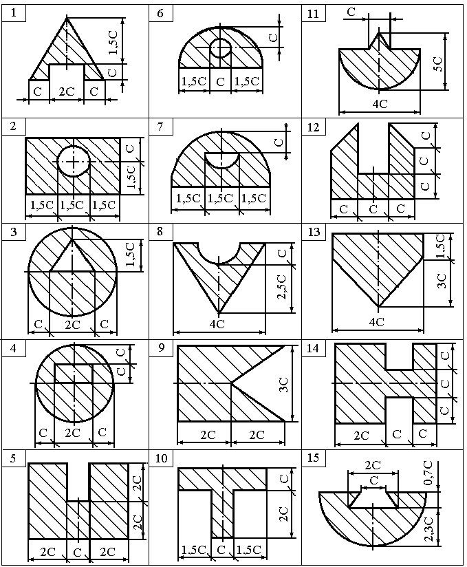 1.Определить положение центра тяжести. 2. Вычислить величину моментов инерции относительно центральных осей (в вариантах 1 – 30 – это главные моменты инерции). 3. В вариантах 31 – 60 определить положение главных центральных осей. 4. Вычислить величину главных моментов инерции. 5. Вычертить сечение в масштабе и указать на нем все размеры; нанести все оси координат.