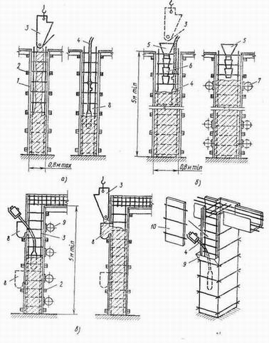 Технологические схемы бетонирования колонн Технологические схемы бетонирования колонн высотой до 5 м (а) и более (б), с густой арматурой балок (в), схема опалубки со съемным щитом (г): 1-опалубка, 2 - хомут, 3 - бадья, 4 - вибратор с гибким валом 5-приемная воронка, 6-звеньевой хобот, 7-навесной вибратор, 9-карманы, 10 — съемный щит.