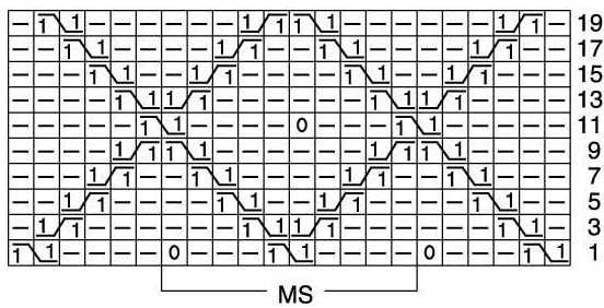 Узор из кос: число петель кратно 12 + 2 кром. Вязать, как узор из листьев, но по схеме 2. Повторить 1 раз с 1 -го по 32-й р., затем 1 раз с 1 -го по 24-й р.