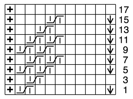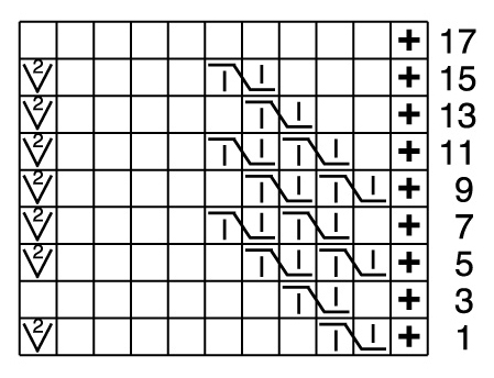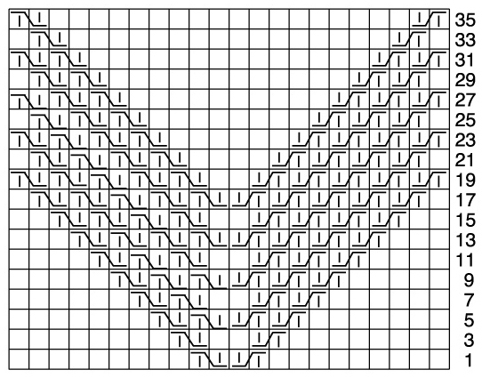 схема 3 Условные обозначения: схема 4 | \ | две петли перекрестить налево: оставить 1 петлю перед работой на вспомогательной спице, провязать 1 лиц. петлю и провязать 1 петлю лиц. со вспомогательной спицы, | / | две петли перекрестить направо: оставить 1 петлю за работой на вспомогательной спице, провязать 1 лиц. петлю и провязать 1 петлю лиц. со вспомогательной спицы, 2 или | V V провязать 2 петли вместе лиц/ или 1 протяжка: снять 1 п. как лиц., провязать 1 лиц. и протянуть ее через снятую петлю + кромочная петля